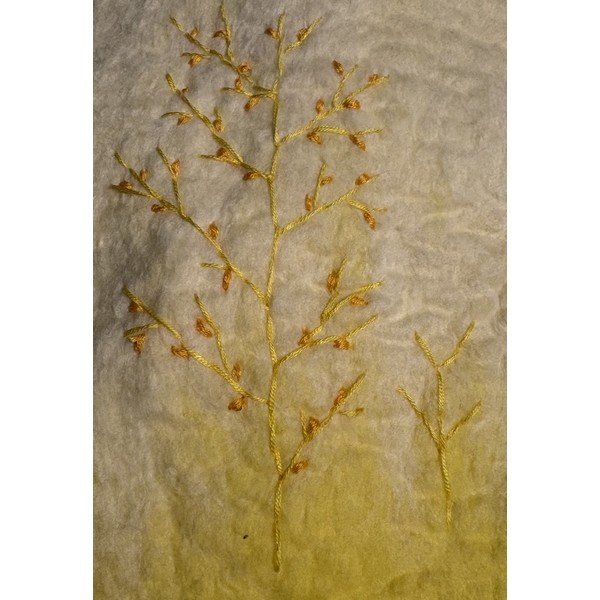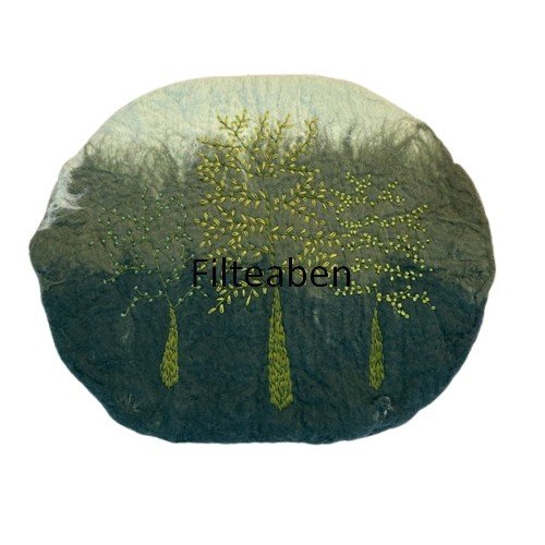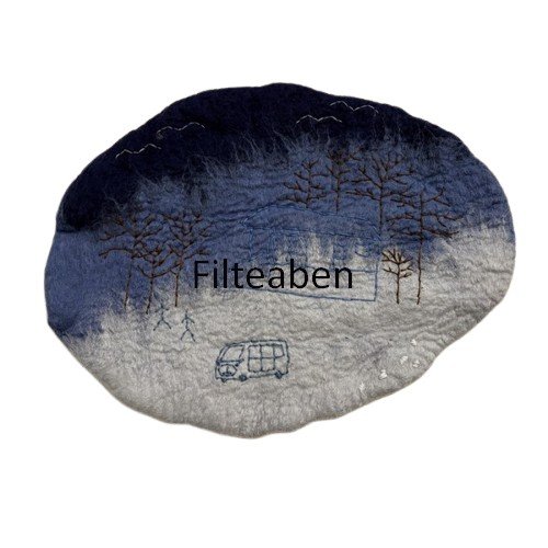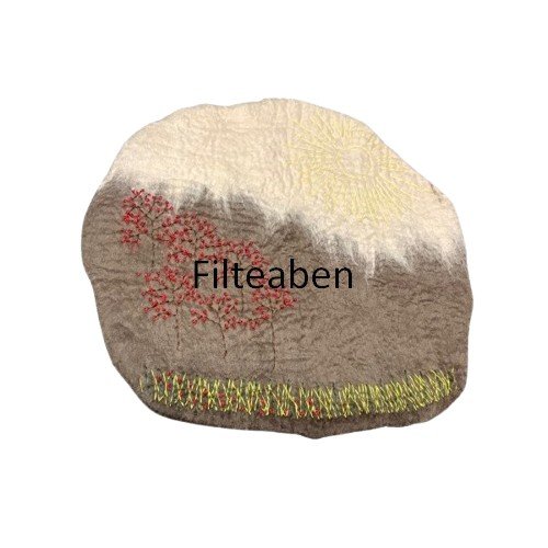 Når filtningen har nået et stabilt stadie, broderer jeg direkte i filten med fri broderi. For mig er det vigtigt, at tråden skjules inde i filten, så den ikke kan ses på bagsiden, og så den kan indarbejdes ordentligt i filten under den efterfølgende filtning. Jeg har valgt polyestertråd, fordi bomuldstråd kan krympe og trække ulden yderligere sammen, mens polyestertråden blot lægger sig i ulden.