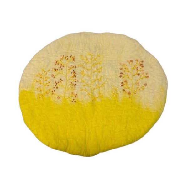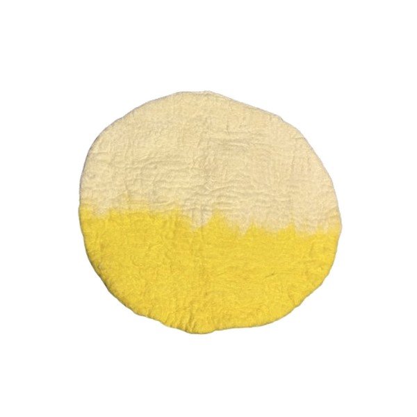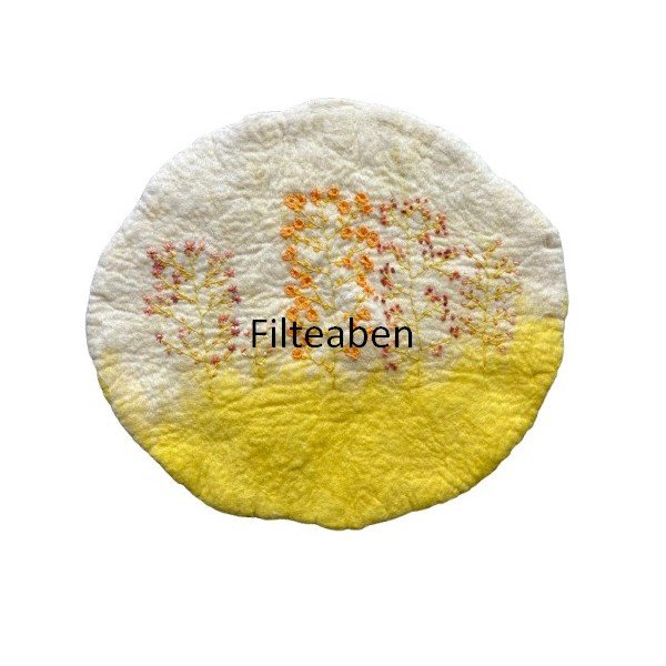 Dette filtet siddeunderlag er noget, jeg hygger mig med at arbejde på for tiden. Det er udført i merinould og vises her midt i processen. Underlaget er vådfiltet på en skabelon, der måler 45 × 40 cm, og efter endt filtning har det en størrelse på cirka 40 × 37 cm. Jeg har brugt i alt 130 g merinould – 90 g gul og 40 g lys citron – som tilsammen giver et harmonisk farveskift i overfladen.